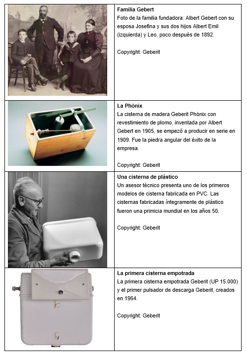 La historia de Geberit comenzó en 1874 como empresa con un único empleado en el centro histórico de la ciudad suiza de Rapperswil. Treinta años después, el fundador de la empresa, Albert Gebert, desarrolló una cisterna de madera revestida de plomo. La historia de éxito continuó con la invención de la primera cisterna de plástico en 1952 y de la cisterna empotrada en 1964. En 1978, el espíritu pionero y visionario de Geberit destacó, también, con la presentación del primer inodoro con función de ducha integrada para la higiene íntima con agua.
