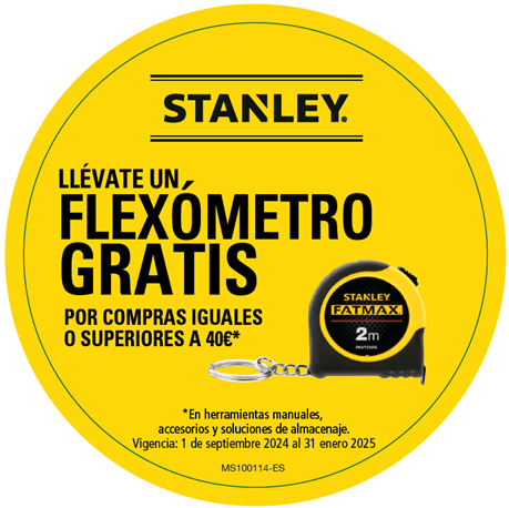 Sinónimo de calidad, seguridad, innovación y valor, STANLEY es la marca más conocida en cintas métricas en todo el mundo por su precisión y confiabilidad. Ahora, por compras superiores a 40€ en herramientas manuales, accesorios y soluciones de almacenaje, te podrás llevar un flexómetro gratis. ¡No desaproveches la oportunidad y ve a tu punto de venta habitual para conseguirlo!